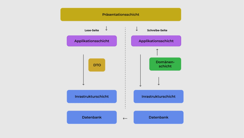 Für sehr komplexe Bounded Contexts kann auch das CQRS-Muster gewählt werden. Dieses trennt, wie in der Abbildung zu sehen, Lese- und Schreib-Operationen. Das hat den großen Vorteil, dass Anforderungen der Benutzeroberfläche (z.B. komplexe Datenansichten) nicht das Domänenmodell verunreinigen.