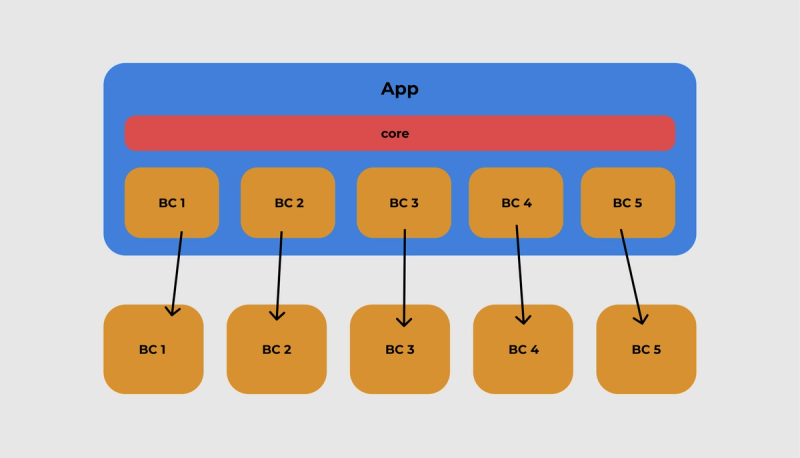 Die resultierende Struktur der Anwendung ist in folgender Abbildung zu sehen (BC=Bounded Context):